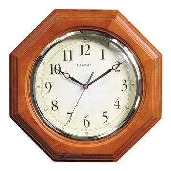 This wall clock has an octagonal solid oak case with wood grain pattern for a classic look.